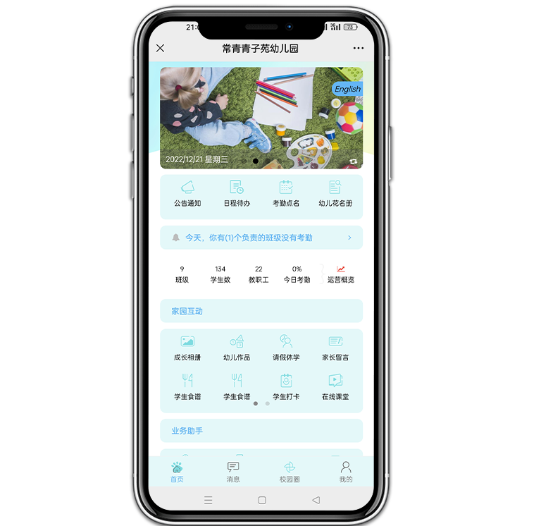 移动互联时代背景下,校园可应用系统快速实现移动互联应用,更简单的接入,更方便的应用,更丰富的呈现,有效提升园所的运营管理效率,同时可增进各方互动,赢得更多认可和信任。