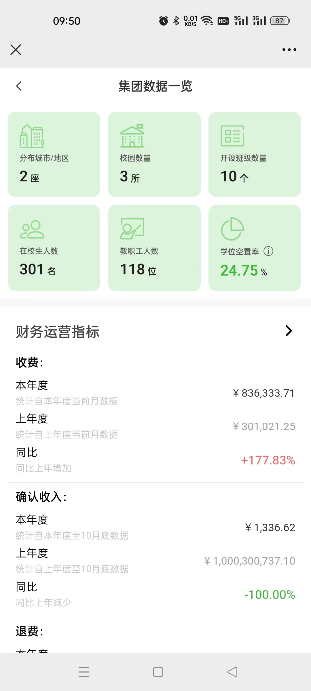园长或管理者可通过管理看板快速了解日常运营及不同业务领域/范畴的业务数据